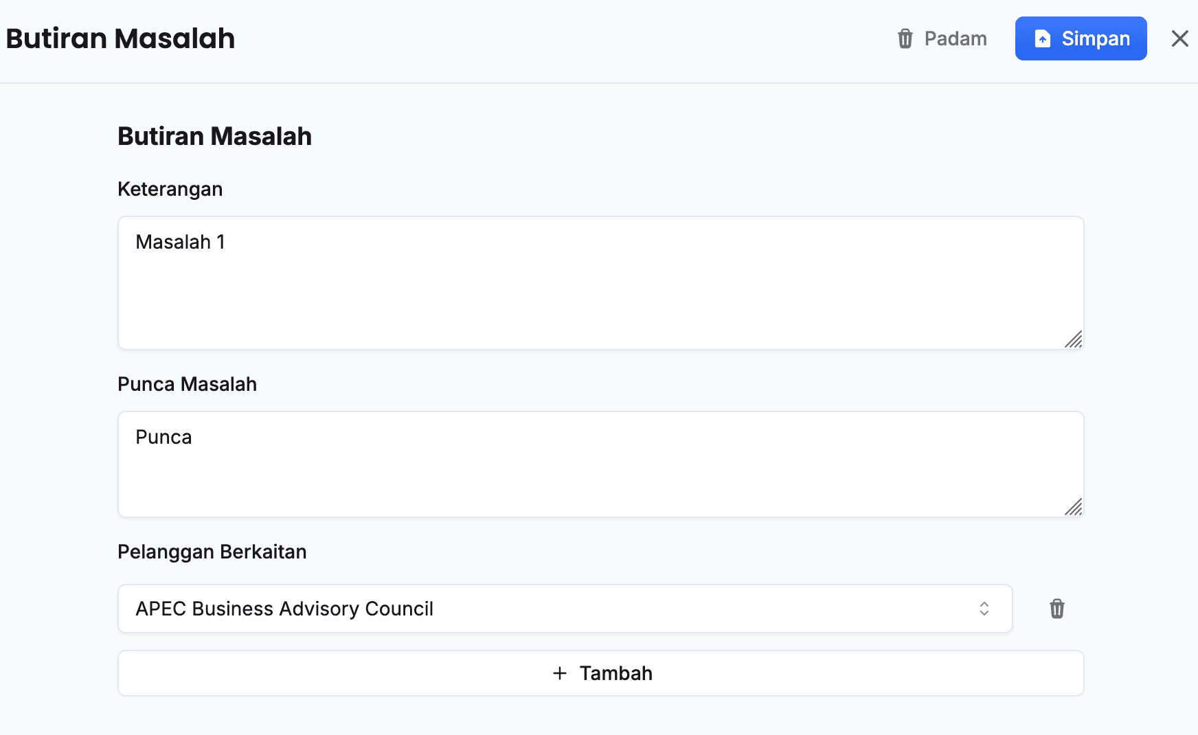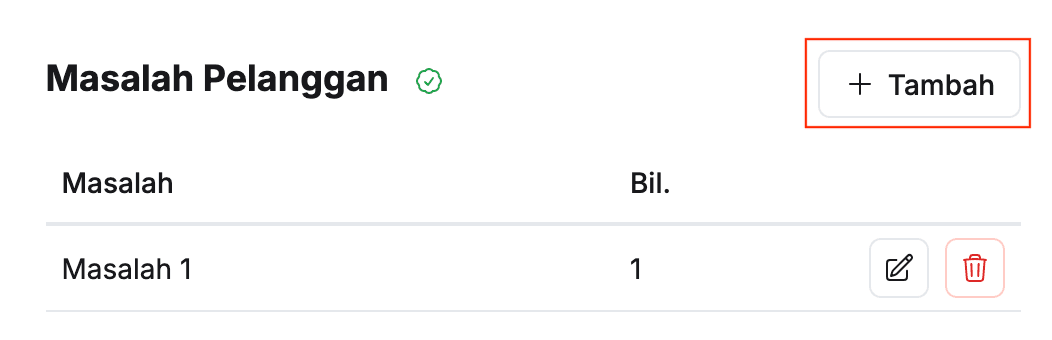 - Klik butang + Tambah pada sudut kanan tajuk Masalah