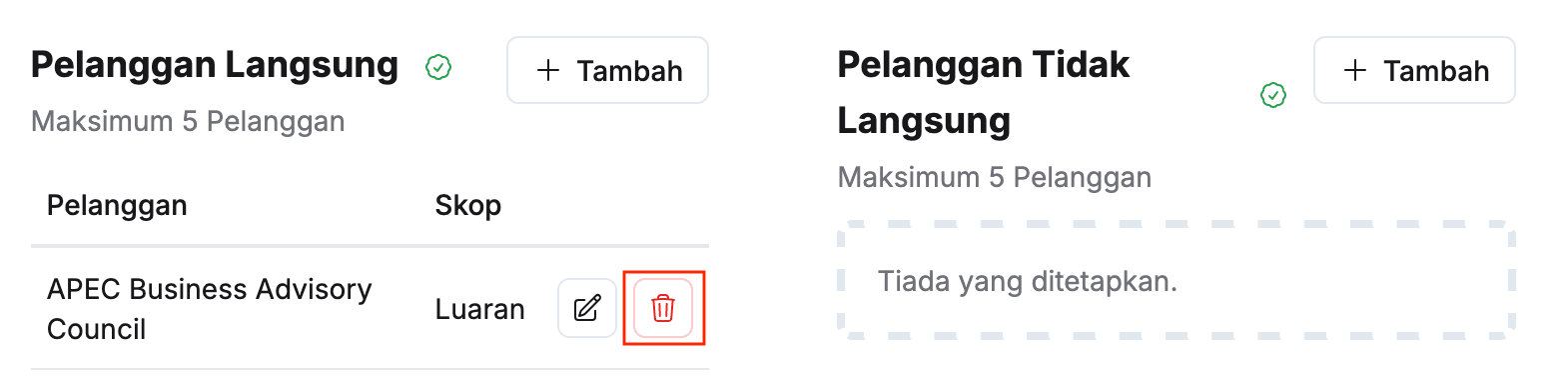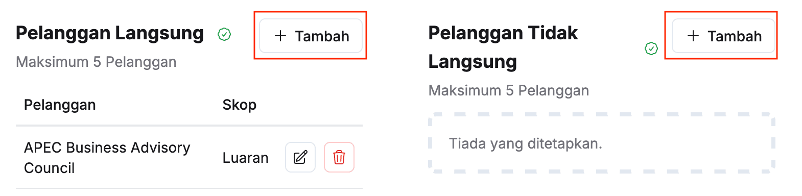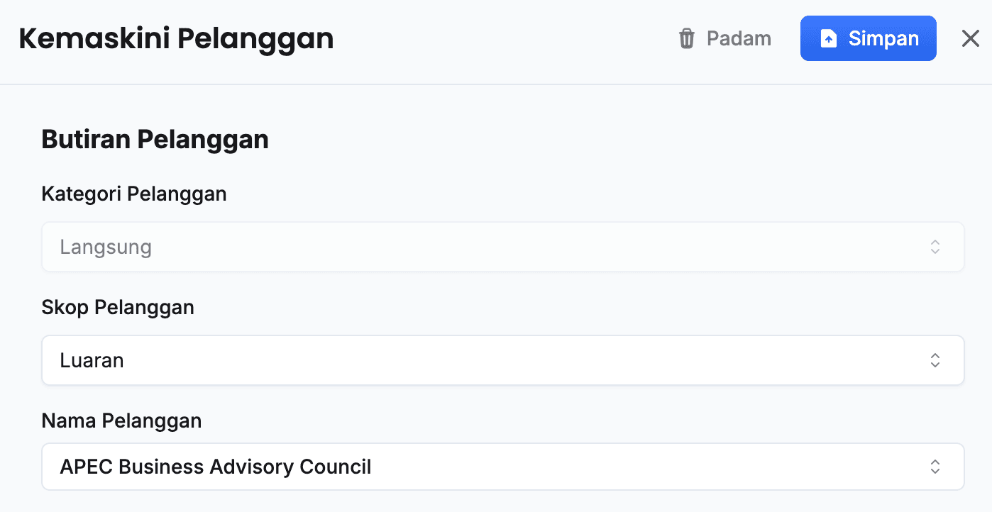 - Klik butang + Tambah pada sudut kanan tajuk Pelanggan Langsung / Pelanggan Tidak Langsung