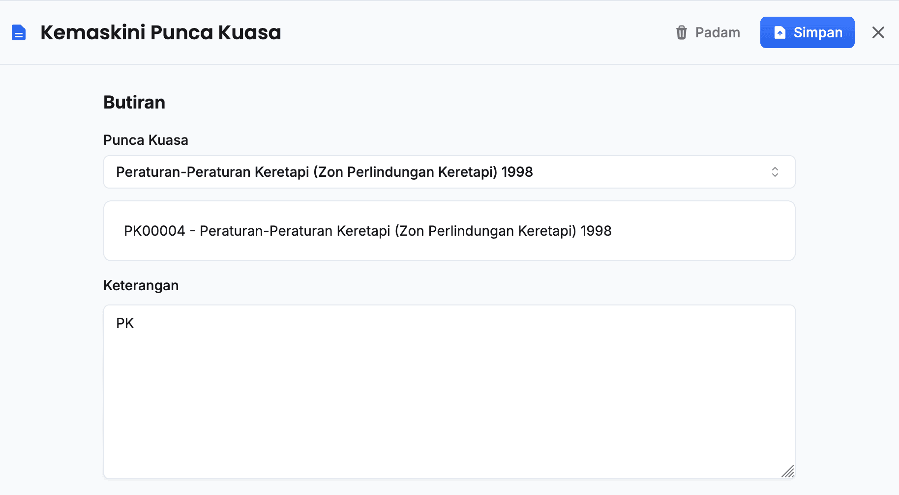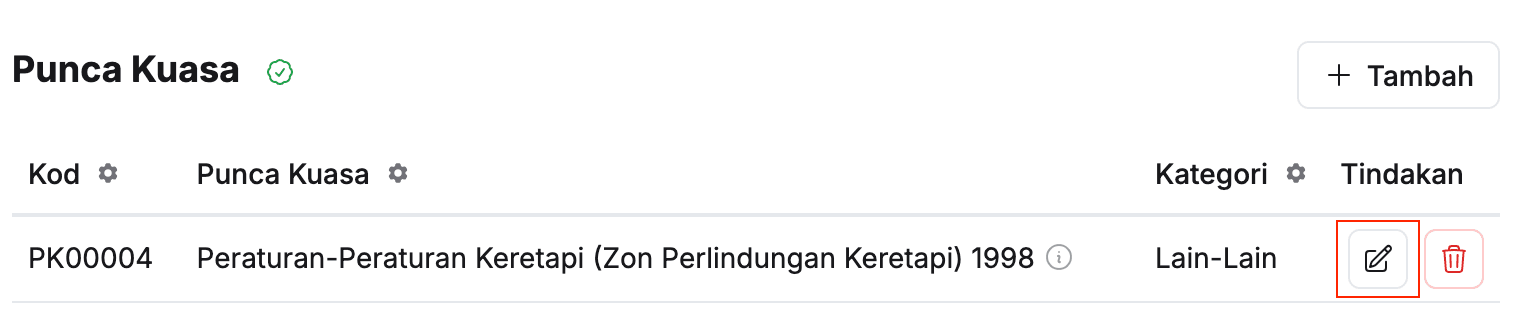 - Pastikan maklumat punca kuasa yang berkaitan telah dikemaskini