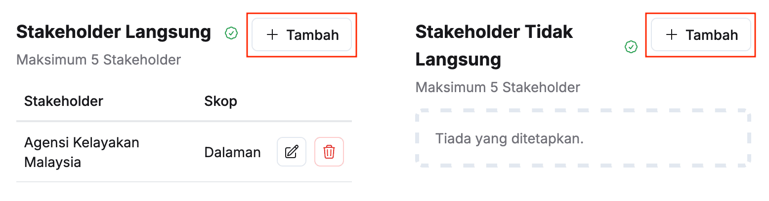 - Klik butang + Tambah pada sudut kanan tajuk Stakeholder Langsung / Stakeholder Tidak Langsung