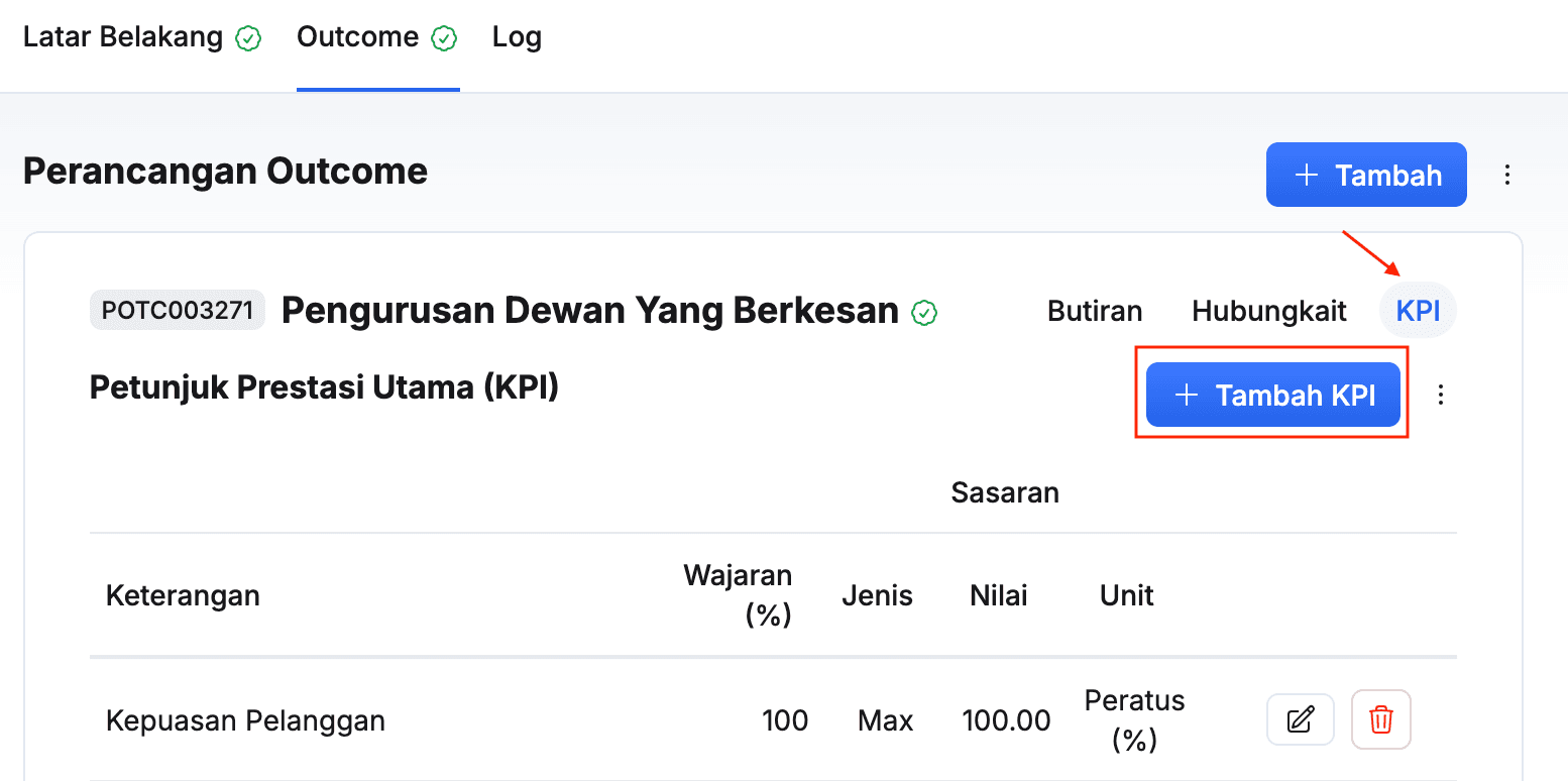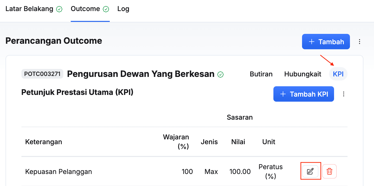 - Klik KPI pada sudut kanan outcome yang berkaitan