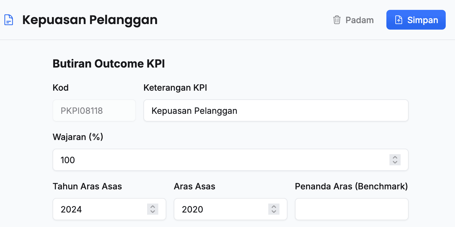 - Isikan maklumat Butiran Outcome KPI dalam medan: