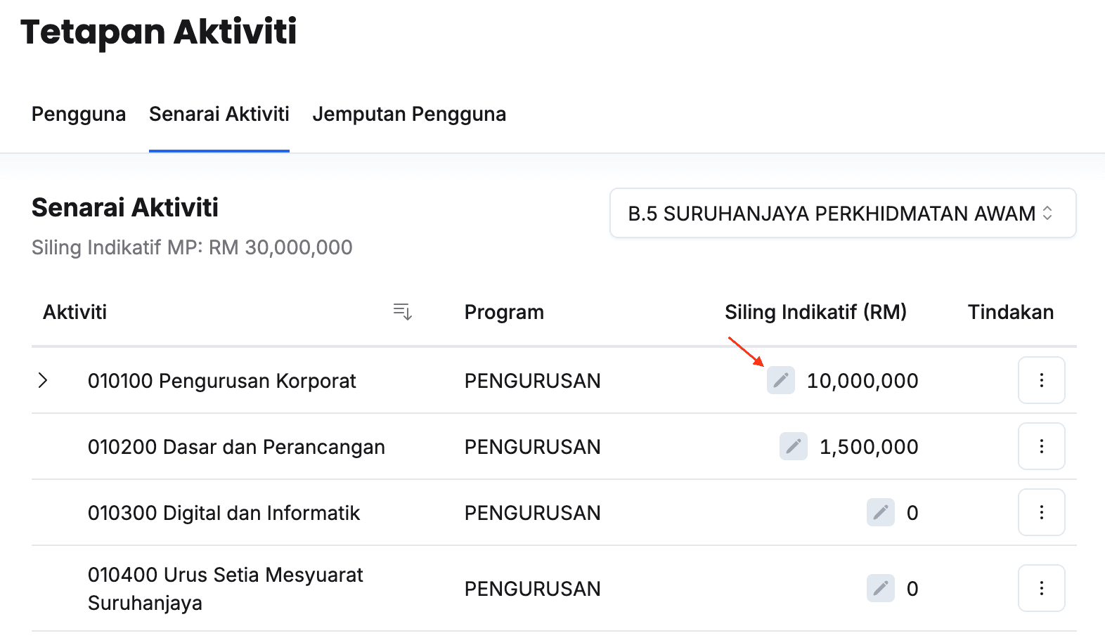 - Klik butang Kemaskini dan kunci masuk Siling Indikatif (RM) pada Aktiviti yang berkaitan