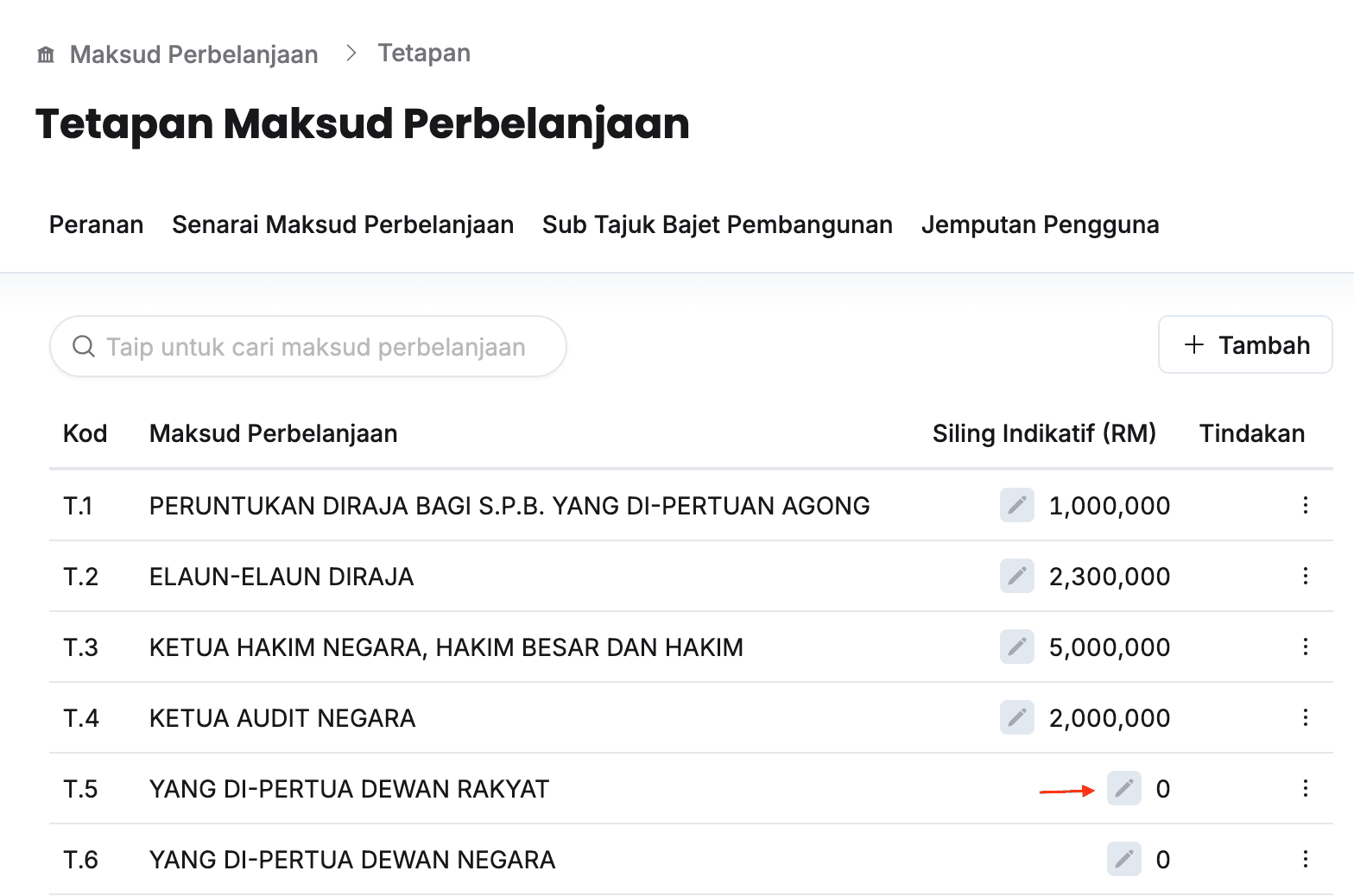 - Klik butang Kemaskini dan kunci masuk Siling Indikatif (RM) pada Maksud Perbelanjaan yang berkaitan