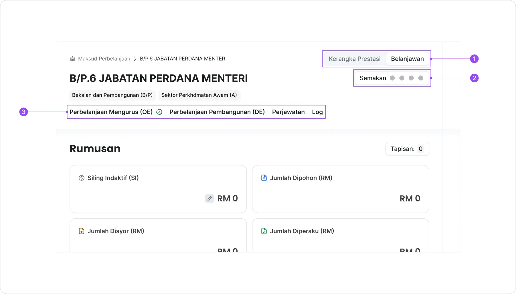 - Butang Togol untuk tukar halaman antara Belanjawan dan Kerangka Prestasi