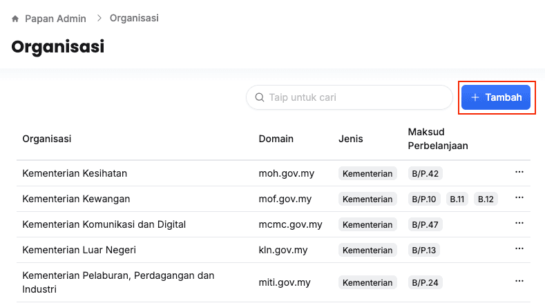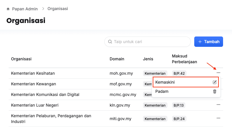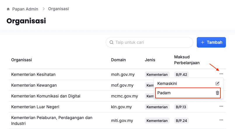 - Klik butang 3 dots pada sudut kanan organisasi yang berkaitan