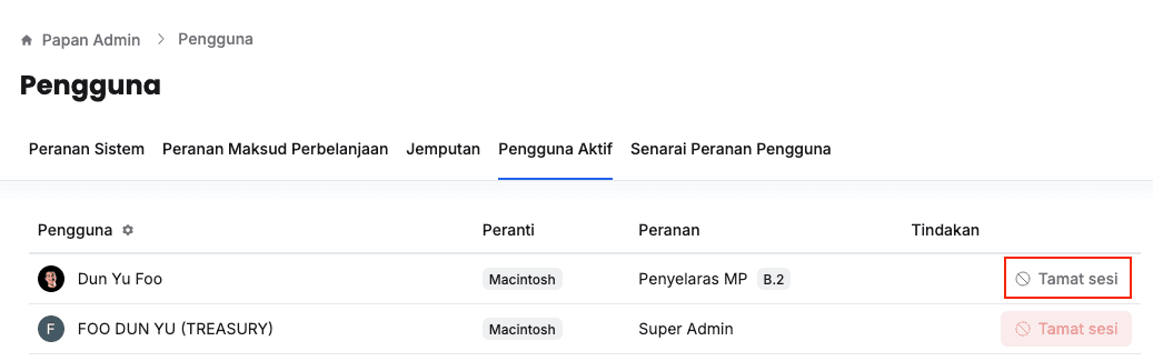 Super admin berjaya menamatkan sesi pengguna yang disyaki menceroboh sistem