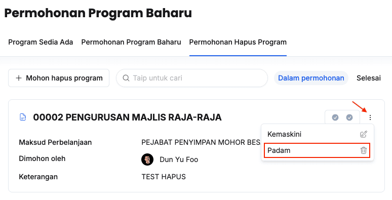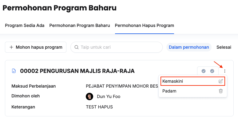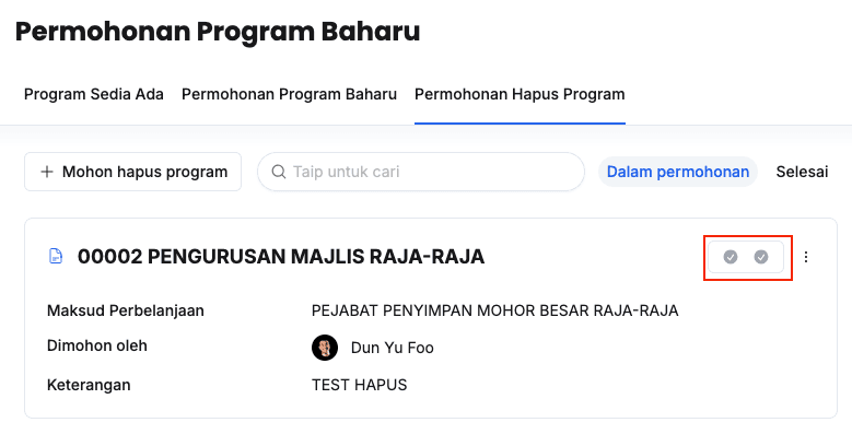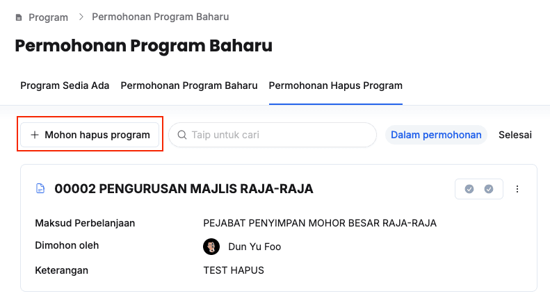 - Penyelaras MP akan menerima notifikasi sekiranya permohonan hapus program ditolak