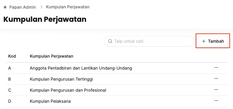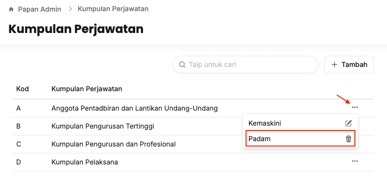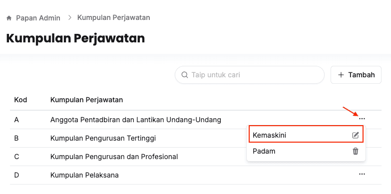- Klik butang 3 dots pada sudut kanan kumpulan perjawatan yang berkaitan